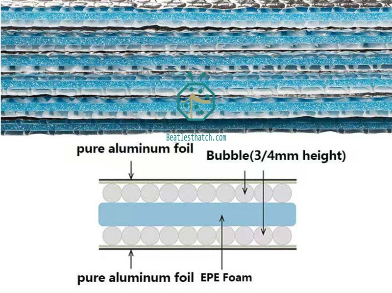 고성능 10mm 난연 알루미늄 호일 단열재. 이중 기포 및 EPE 폼 레이어로 구성되어 있습니다. 열대 휴양지 지붕 및 합성 초가 지붕에 이상적입니다.